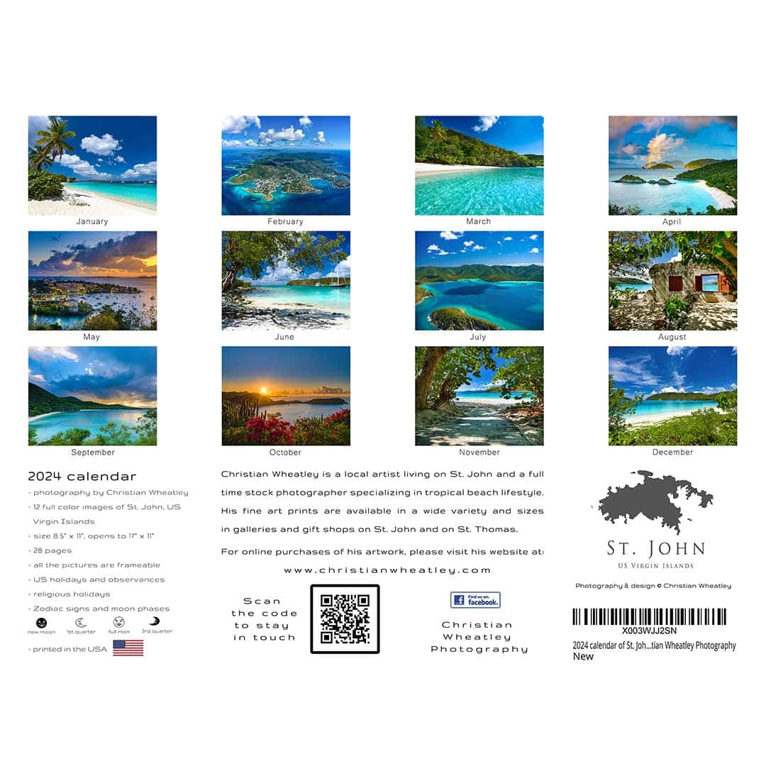This is a limited edition 2026 St. John Calendar with photography by Christian Wheatley. Wheatley is a local artist living on St. John and a full-time photographer specializing in tropical beach lifestyle.