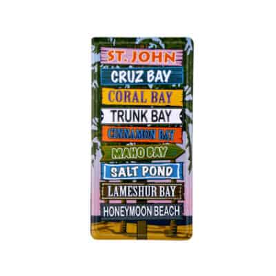 A fun magnet for St. John with beach signs that include St. John, Cruz Bay, Coral Bay, Trunk Bay, Cinnamon By, Maho Bay, Salt Pond, Lameshur Bay, Honeymoon Beach. 3 inches x 1 ¾ inches.